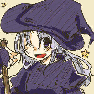 紫色の大きな山高帽子に、同じ色のドレス。傍らには竹の箒。